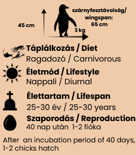 It earns its Hungarian name (“spectacled penguin”) from the pink patches of skin above its eyes, which play a role in regulating body temperature. While swimming, its white belly deceives underwater predators, while its black back camouflages it from predatory birds above.